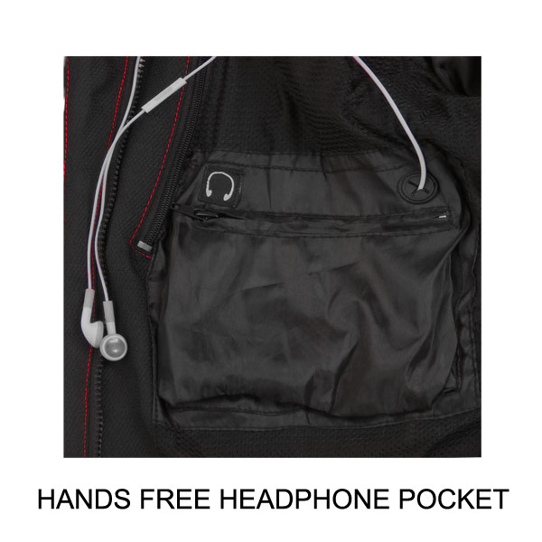 100% водонепроницаемый, дышащий текстиль, устойчивый к повреждениям. Прилагается красный свитер с рукавами и капюшоном с двумя карманами, на молнии. Съёмная защита: плечи, локти и спина. Внутренняя сетчатая подкладка. Открывающиеся карманы вентиляции на спине и рукавах. Светоотражающие полосы. Карманы на молниях: два спереди, один внутренний, один внутренний для MP3.